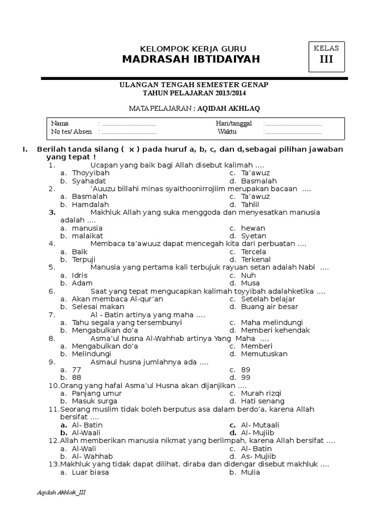 Soal aqidah akhlak kelas 4 sd mi semester 1 dan kunci jawaban. Bacalah setiap soal dengan teliti. Home › soal uts aqidah akhlak kelas 6 mi semester 1. Soal uas semester ganjil k13 agama katolik kelas 6. Dowload soal uts akidah akhlak kls 1 semester 2.berilah tanda silang x pada abjad a b.